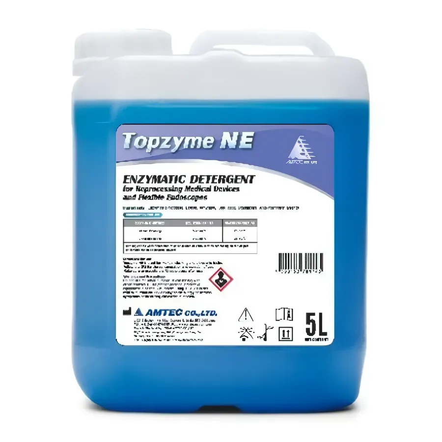 Topzyme NE is a multi-enzymatic detergent for medical devices and flexible endoscopes. It contains protease, lipase, amylase, and cellulase for effective residue removal, including biofilm. Low-foaming, pH-neutral, and corrosion-resistant, it is suitable for manual and ultrasonic cleaning.