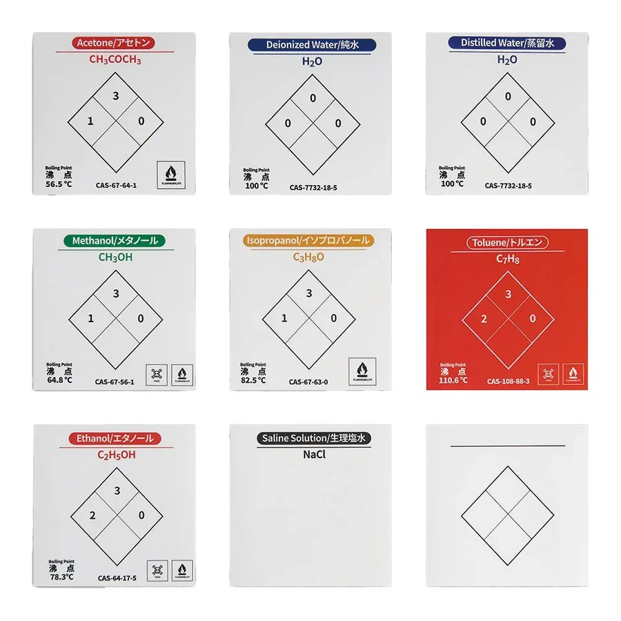 Labels help you identify the type of liquid at a glance.